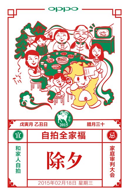 春节——元旦的热潮刚过,春节又是一波大作战。要说春节的元素,无非就是剪纸、团圆。让人尤其记忆深刻的是2015年OPPO在一片红彤彤中的红绿配色中推出的海报,不仅将品牌logo的主色调用在其中,而且人家搭配的还不难看。海报上以年画的形式表现了一家人,既有中国春节的元素,又恰巧契合了“阖家团圆”的主题,这个拍照手机可以的。