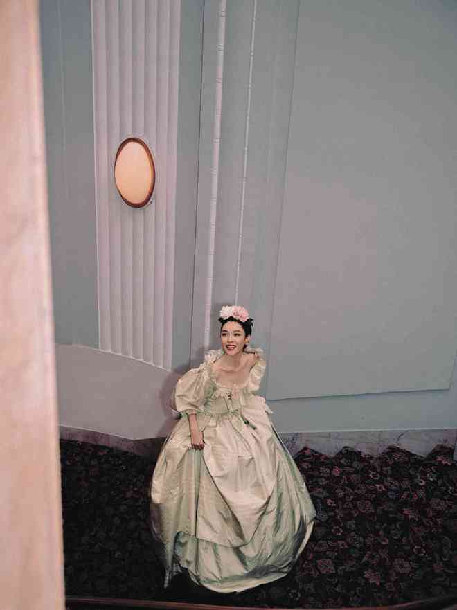 她这次的出发图也特别有意思,选在了花园里取景。在冷色调的滤镜下,她手持绢花,倚着栏杆,整个画面就像一幅精心构图的古典肖像画,进一步强化了那种复古油画的氛围感。从出发到红毯,整个美学概念一气呵成,非常完整。